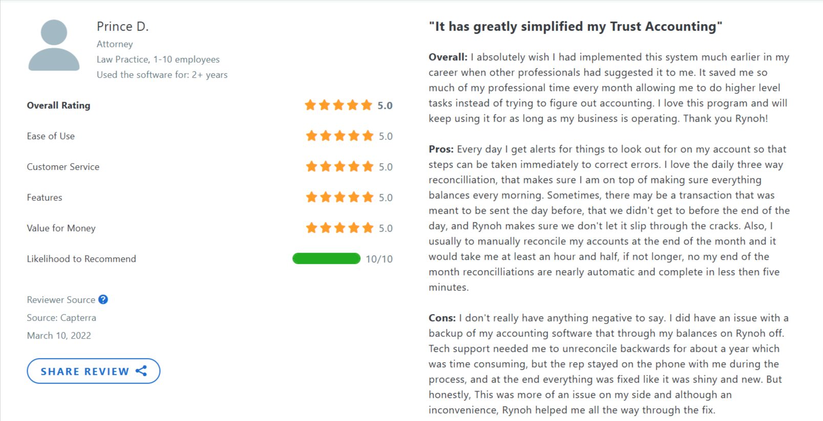 For Prince D., RynohLive has become an indispensable tool in simplifying trust accounting processes. With automated reconciliation, proactive alerts, and exceptional customer support, the platform ensures efficiency and reliability, empowering professionals to focus on what truly matters in their business.