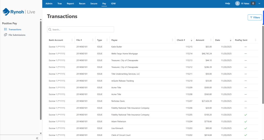 Escrow accounting demands precision, transparency, and security. RynohRecon and Positive Pay work together to: