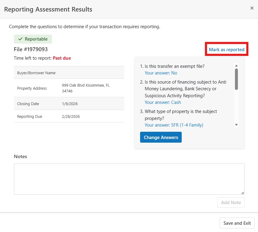 - Select the option to mark the file as Reported.