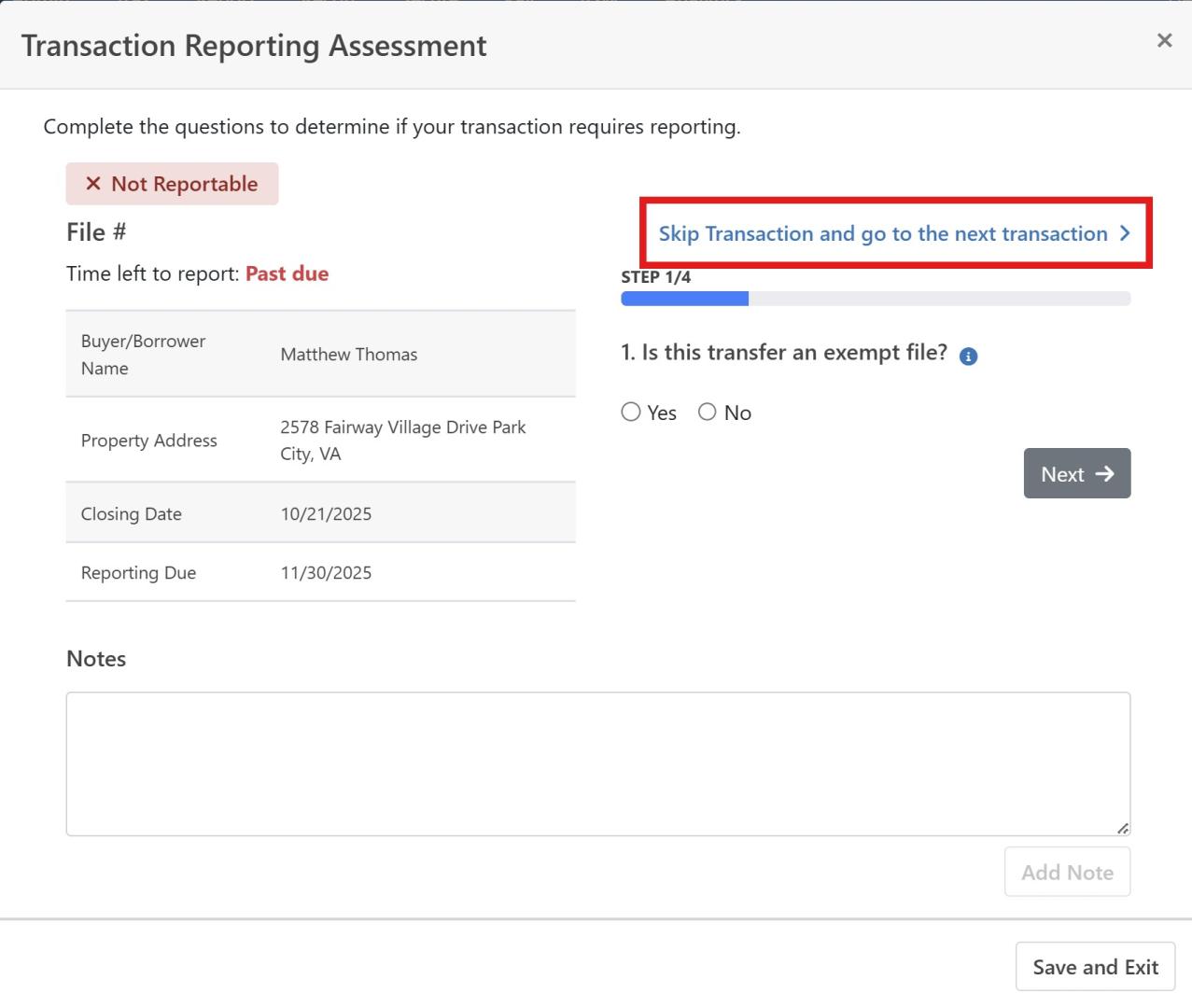 This feature can be accessed by opening the FinCEN report, selecting an Assessment on the Not Reviewed tab and clicking Skip and go to the next transaction.